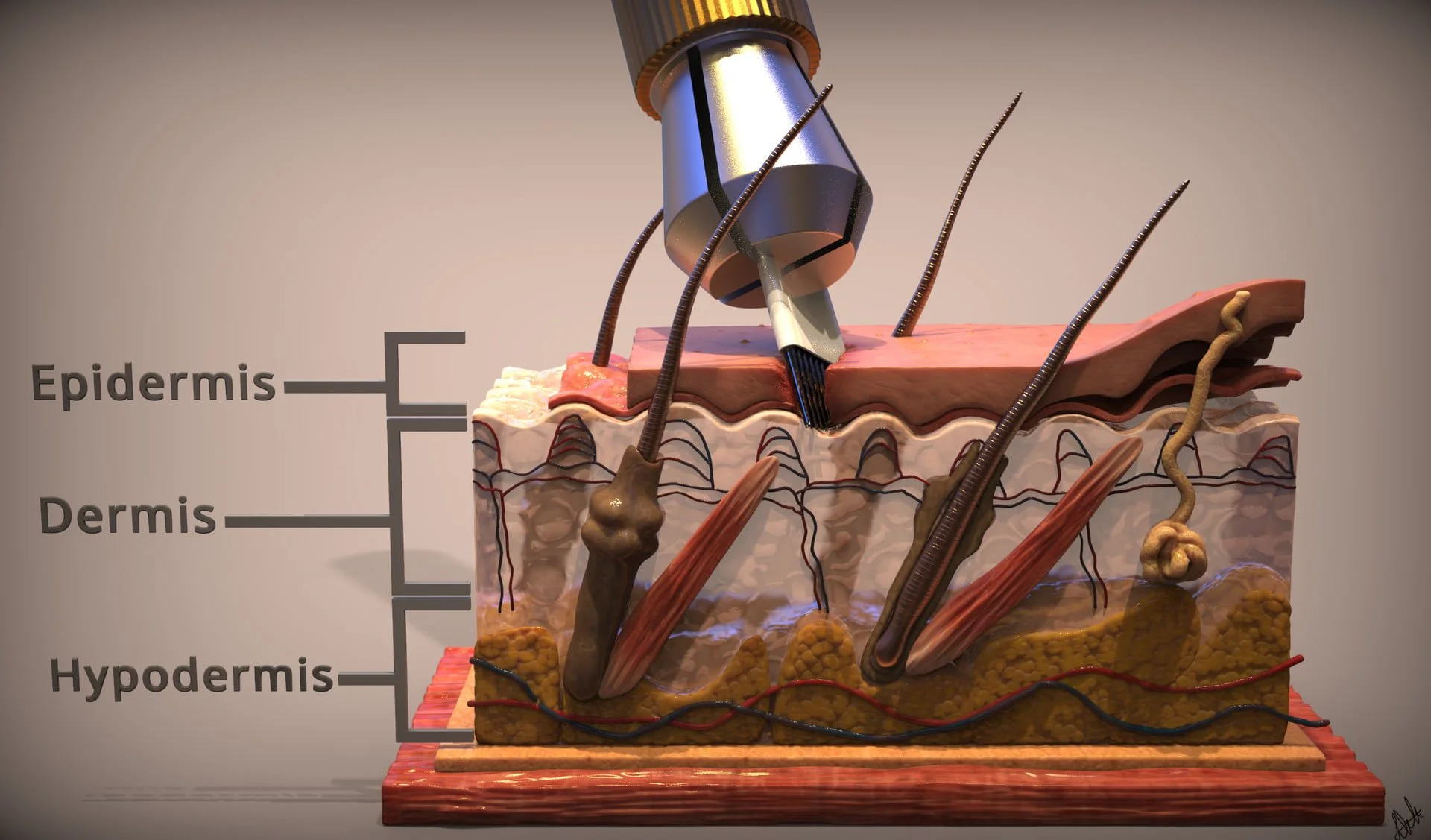 Traditional methods of permanent makeup consist of implanting pigment to the dermis. The dermis is live skin made up of blood vessels, sebaceous glands, sweat glands and nerves. Since this layer of skin is alive, it usually retains pigments permanently. In microblading, pigment is deposited right above the dermis into the basal layer of the epidermis. Because the cells of the basal layer continuously divide, the pigment is then broken down and eventually migrates to the surface causing the pigment to fade away.